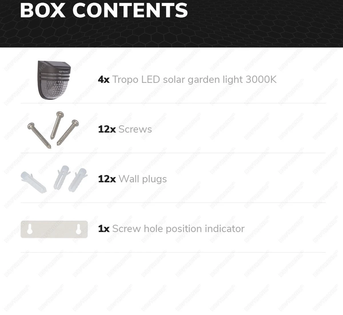 Deze solar wandlampen zijn ideaal voor elke tuin en komen in een set van 4 lampen. Ze werken op zonne-energie, je hoeft ze dus alleen maar op te hangen en de zon doet het werk voor je. De lampen gaan automatisch aan als de zon onder is, zonder dat je er omkijken naar hebt. Ze schijnen een sfeervol witlicht van 3000K en de lamp geeft leuke lichteffecten op de schutting of de gevel.