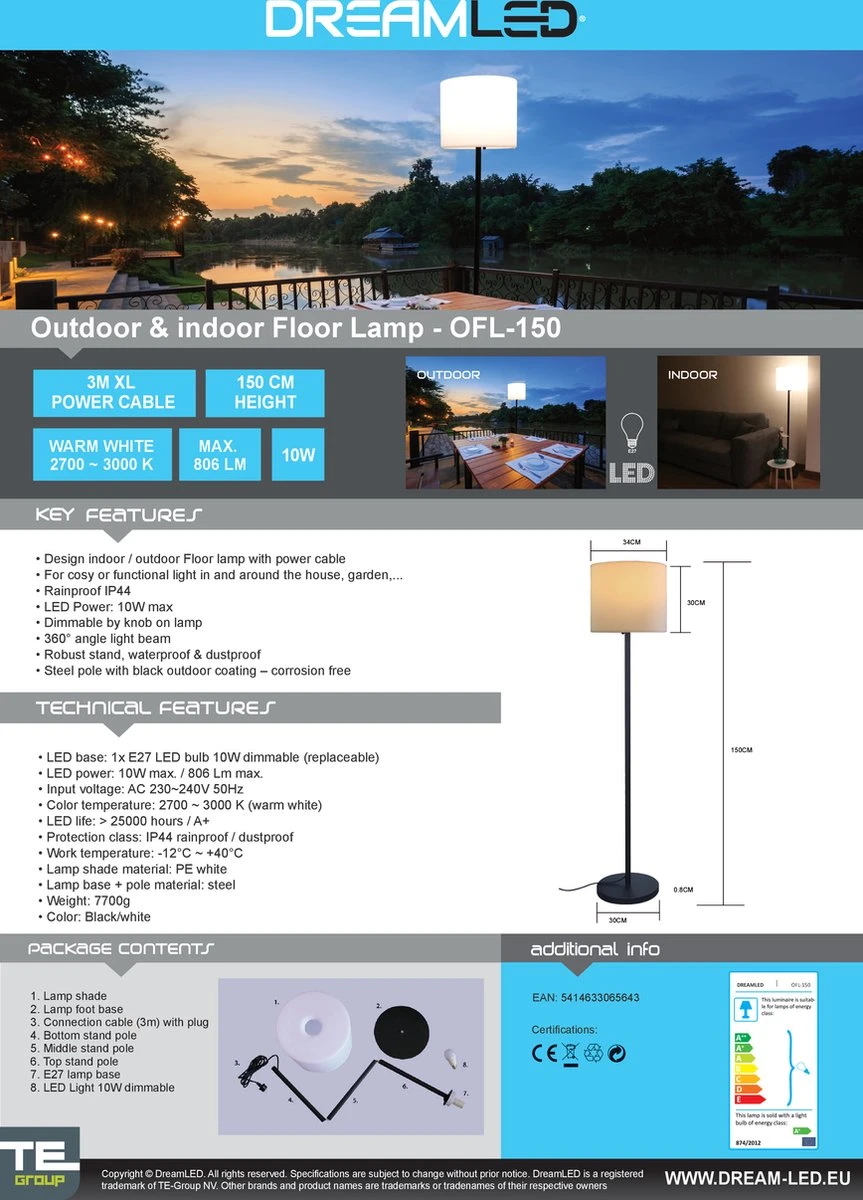 • Design vloerlamp met stroomkabel, voor binnen- en buitengebruik