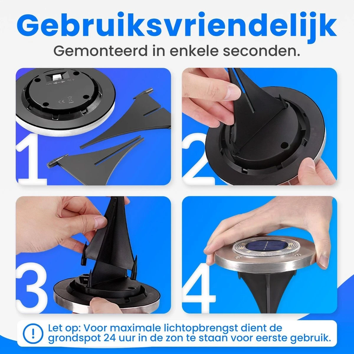 Met de set van vier grondspots kies je voor prikspots van kwaliteit die tot wel tien uur kunnen branden na een dagje zon.