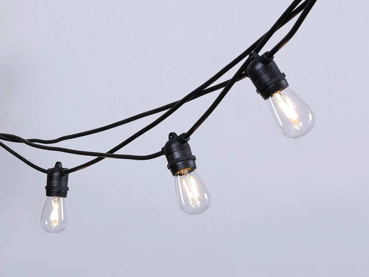 Onze professionele lichtsnoeren van 10 meter met 20 vintage warm witte led-lampen toveren je tuin, evenement of feestlocatie in een mum van tijd om tot een gezellig verlichte plek. Je kan tot wel tien prikkabels met elkaar koppelen en dus een lichtsnoer van honderd meter maken. Bovendien zijn ze volledig waterdicht volgens norm IP65 (ook zwembadverlichting krijgt deze normering). Je kan deze kabels dus perfect in alle weersomstandigheden inzetten of voor langere tijd buiten laten hangen.