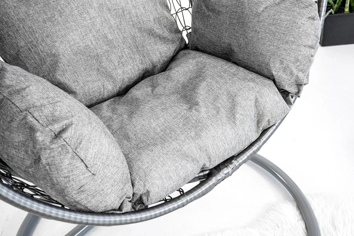 De hangstoel heeft een ei vorm wat een geborgen gevoel geeft en wat er voor zorgt dat je comfortabel zit. De zachte grijze kussens met armleuningen en hoofdsteun zorgen voor extra comfort.