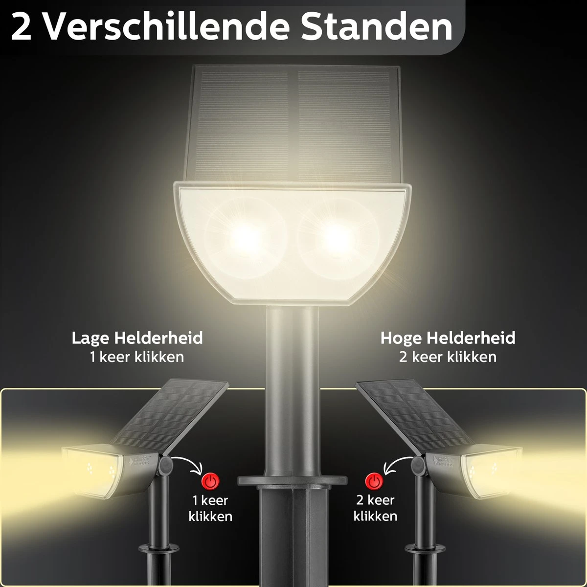 De kop van de solar lamp is 90 graden richtbaar en het zonnepaneel is 90 graden draaibaar naar de zon toe. Door de ingebouwde lichtsensoren vangt de tuinverlichting 100% effectief zonneenergie op. Zodra het donker wordt, gaat de tuinverlichting op zonne energie automatisch aan. Bepaal zelf de sfeer met de 2 verschillende helderheidsstanden op basis van de gelegenheid. Klik 1 keer voor een lage helderheid en klik 2 keer voor een hoge helderheid!