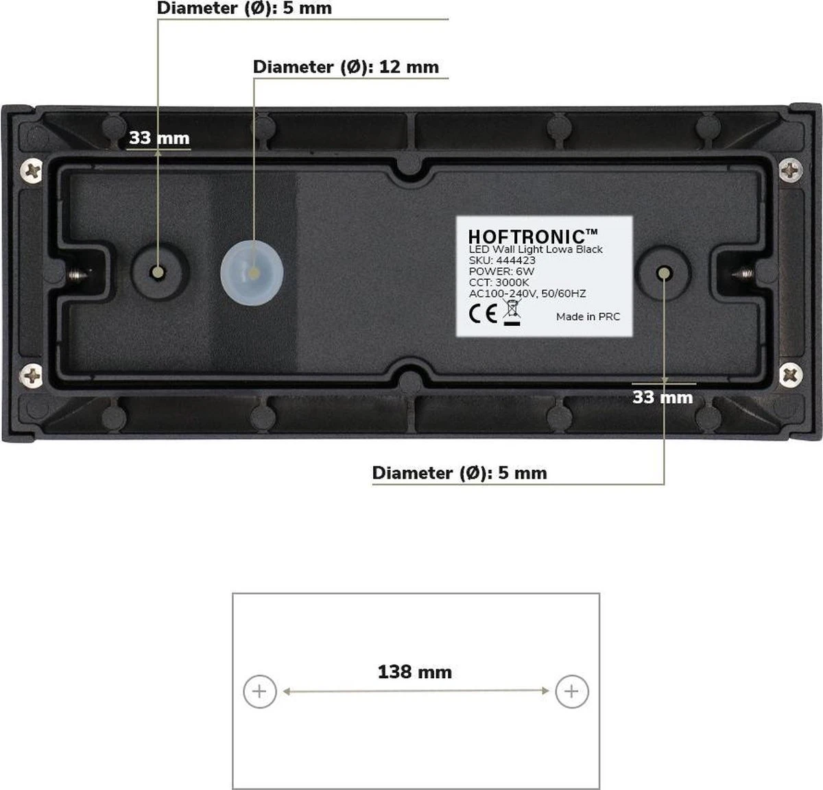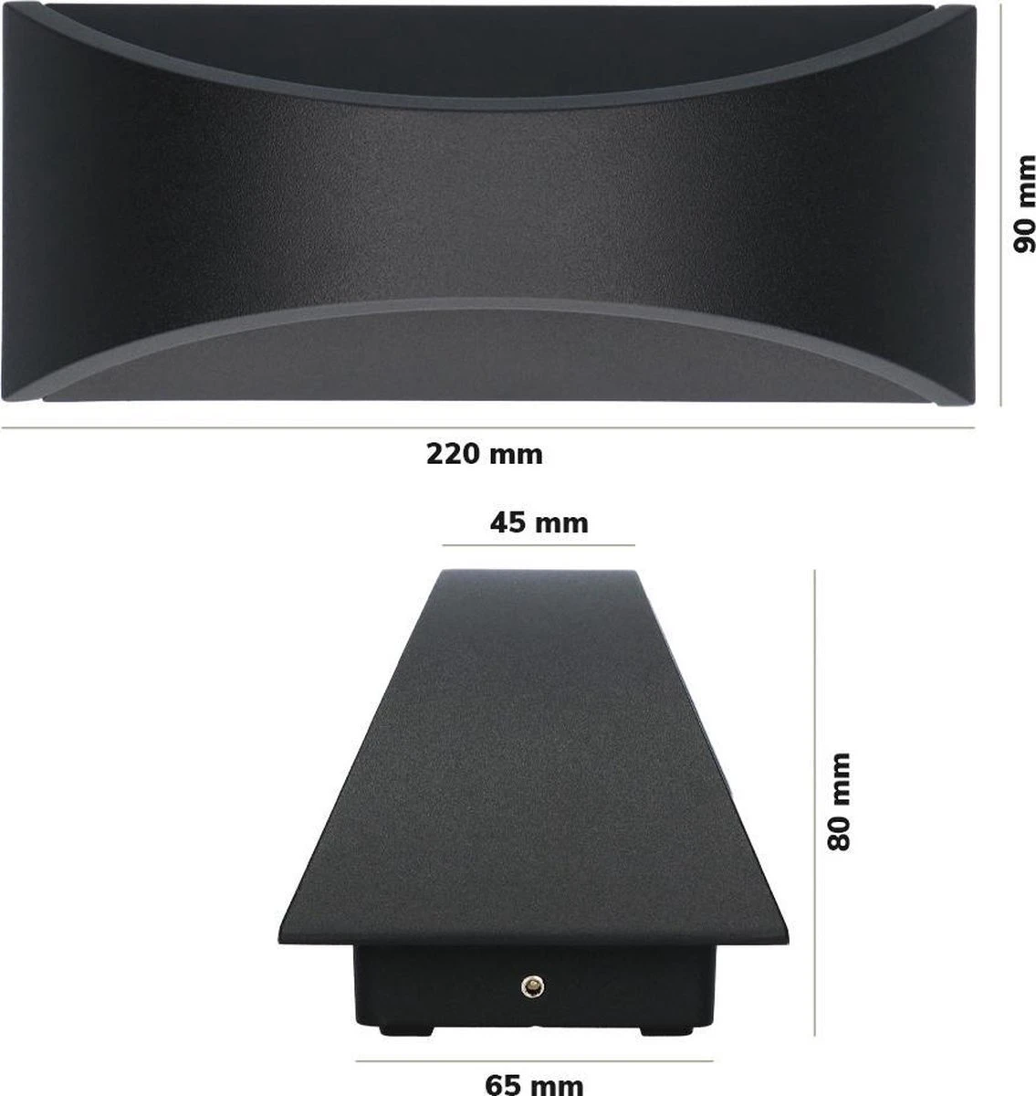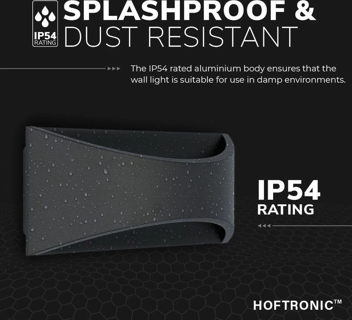 - AKZO-Nobel poedercoating: De Mat zwarte kleur heeft deze LED wandlamp te danken aan zijn vochtbestendige en UV-bestendige poedercoating. Hierdoor verkleurt de buitenwandlamp niet in de zon en bladdert de verf niet af bij langdurige blootstelling aan vocht.