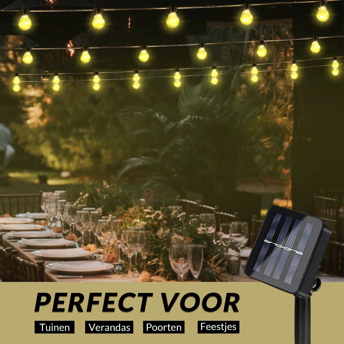 Vanaf het zonnepaneel tot het eerste lichtbolletje zit 2 meter en vanaf dat punt zijn het 20 LED bolletjes op 15 centimeter afstand van elkaar. Door de IP65 beveiliging is het product beschermd tegen hitte, vorst, hagel en regen.