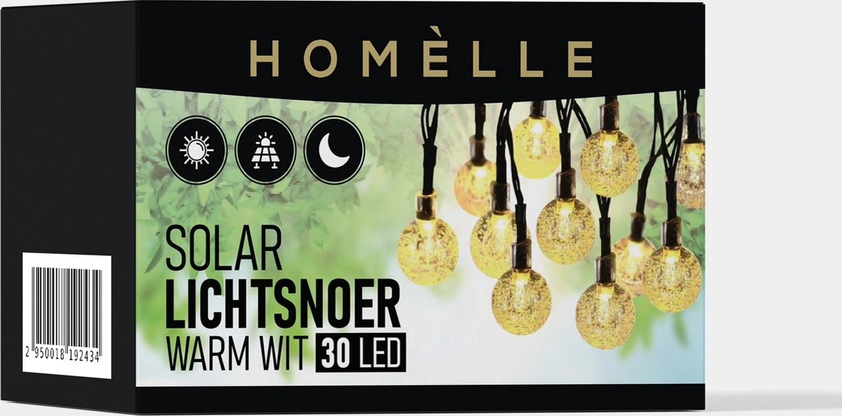Vanaf het zonnepaneel tot het eerste lichtbolletje zit 2 meter en vanaf dat punt zijn het 30 LED bolletjes op 10 centimeter afstand van elkaar. Door de IP65 beveiliging is het product beschermd tegen hitte, vorst, hagel en regen.