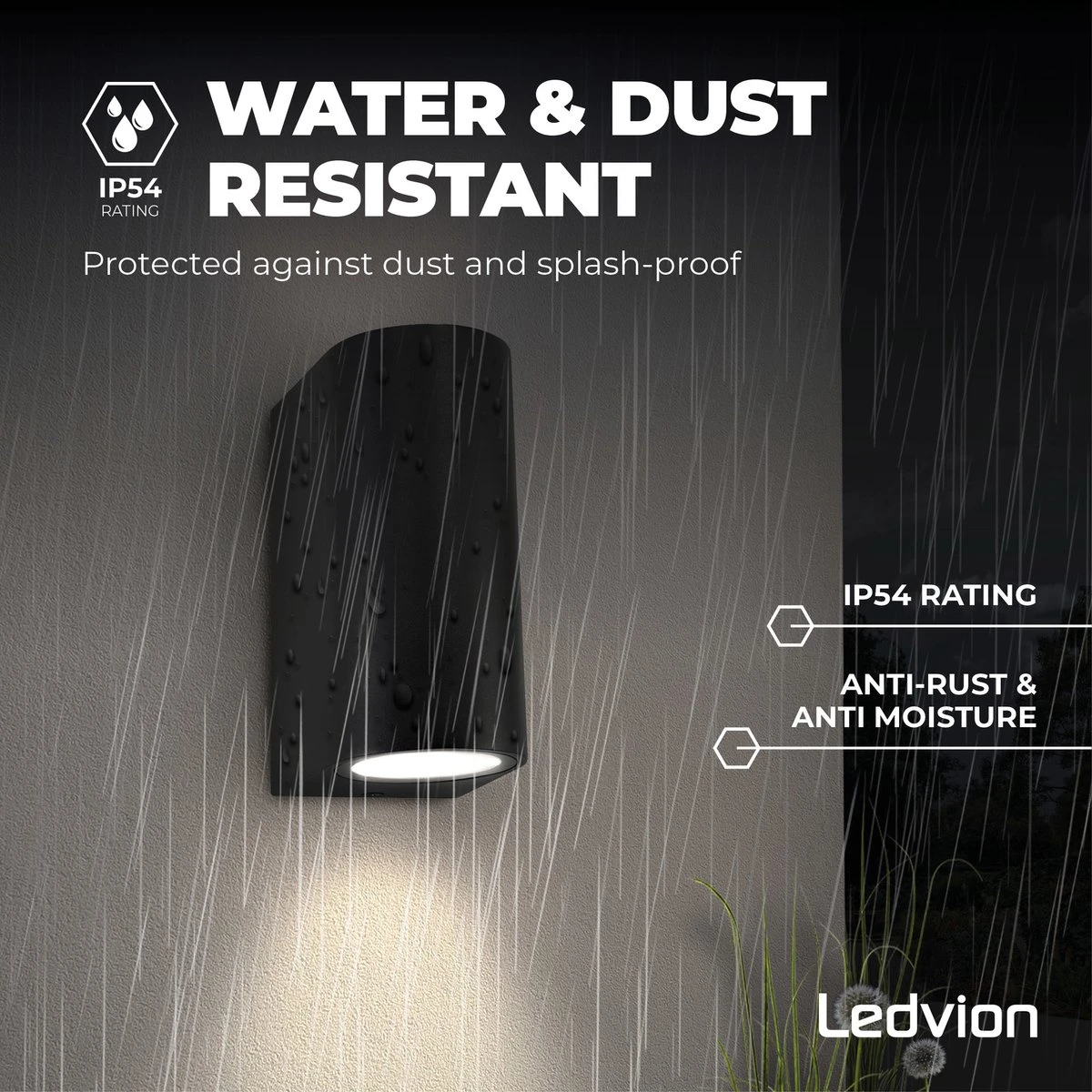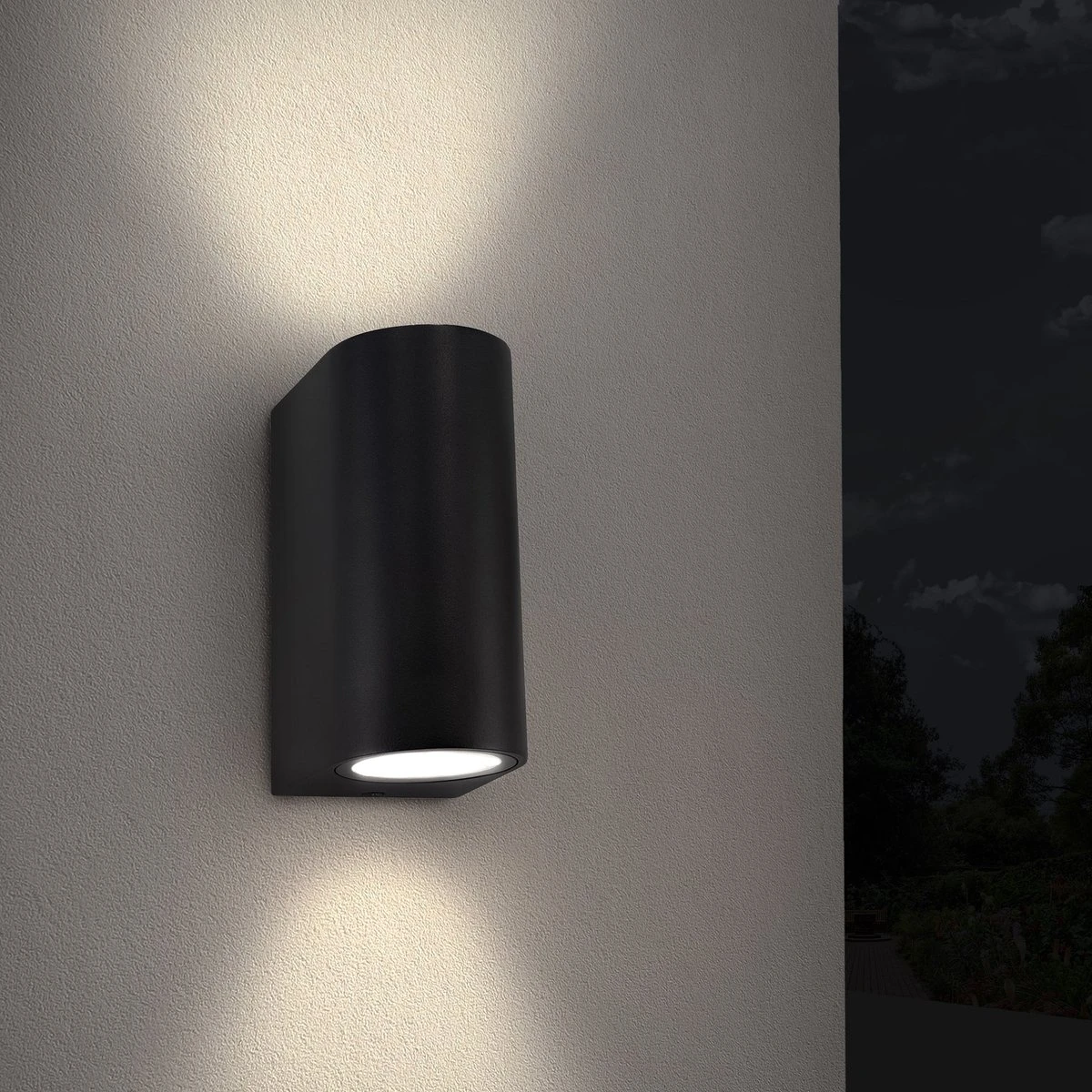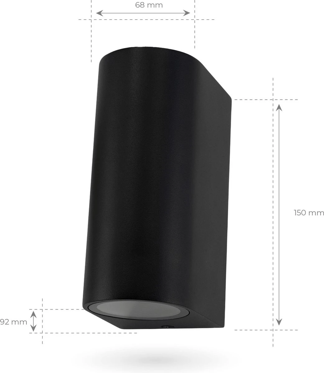- Deze zwarte wandlamp is voorzien van 2 GU10 fittingen en geeft hierdoor een up&down lichteffect op de muur. De lichtkleur van de lamp is zelf te bepalen omdat er geen lamp wordt meegeleverd.