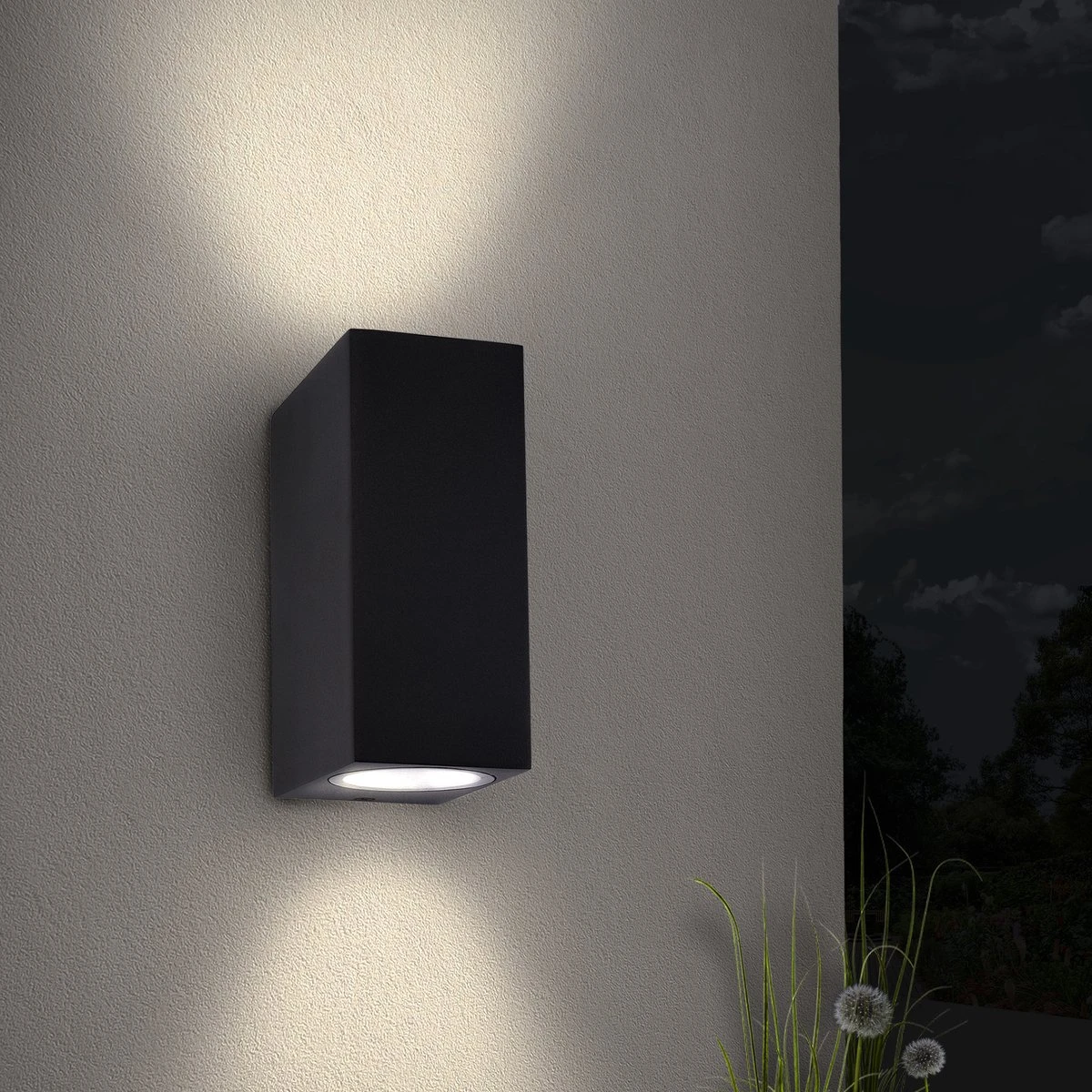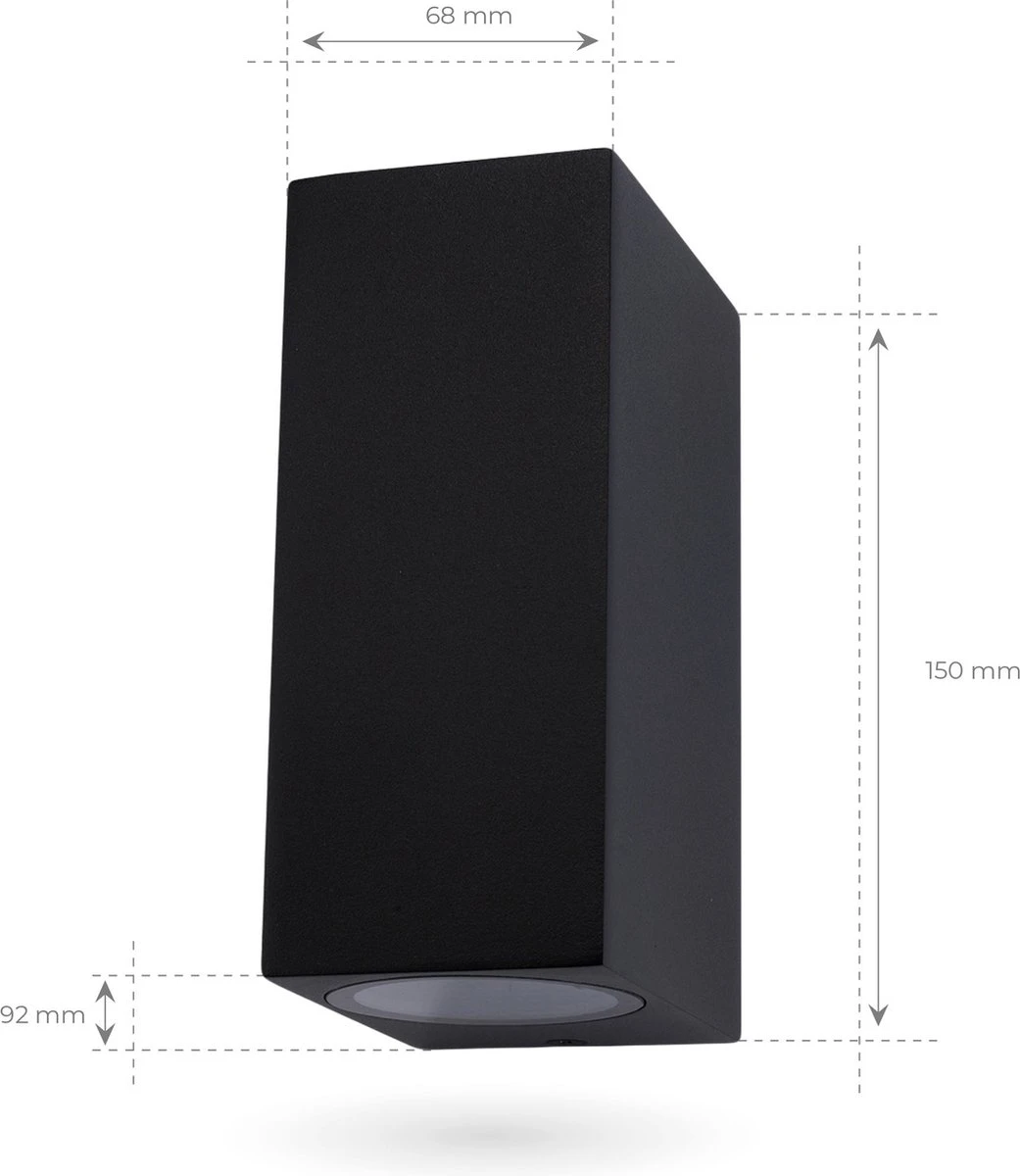 - Deze zwarte wandlamp is voorzien van 2 GU10 fittingen en geeft hierdoor een up&down lichteffect op de muur. De lichtkleur van de lamp is zelf te bepalen omdat er geen lamp wordt meegeleverd.