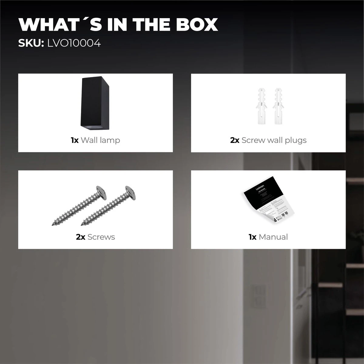 Naast een handleiding wordt er ook een installatiesetje meegeleverd. Aan de hand van het installatiesetje en de handleiding kan je de zwarte muurlamp snel en eenvoudig ophangen.