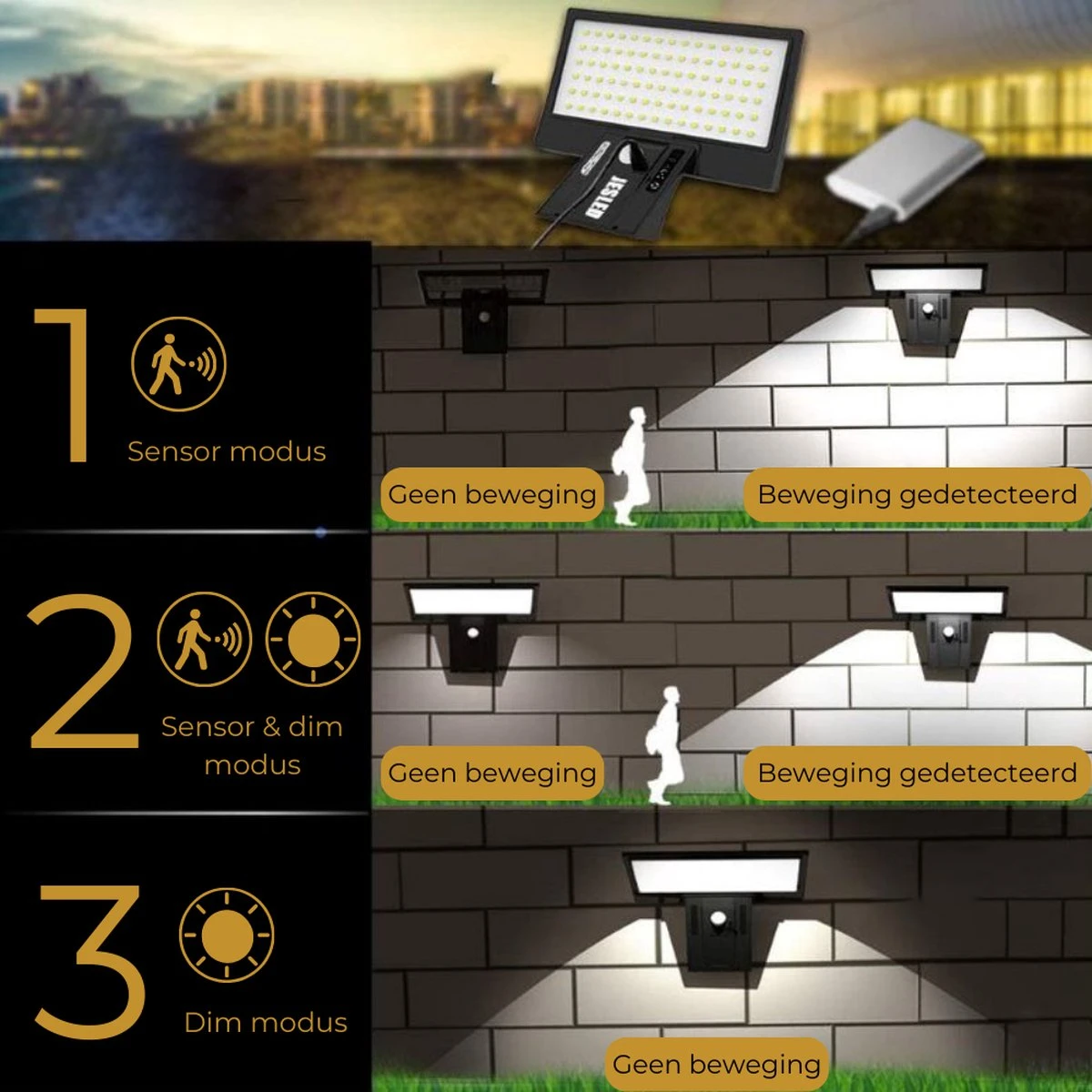 - Sensor & dim modus: de lamp staat continue aan op ‘dimstand’. Als de sensor beweging detecteert zal de lamp helder/fel licht geven
