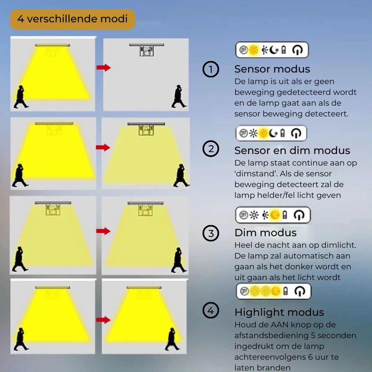 - Sensor modus: de lamp is uit als er geen beweging gedetecteerd wordt en de lamp gaat aan als de sensor beweging detecteert.