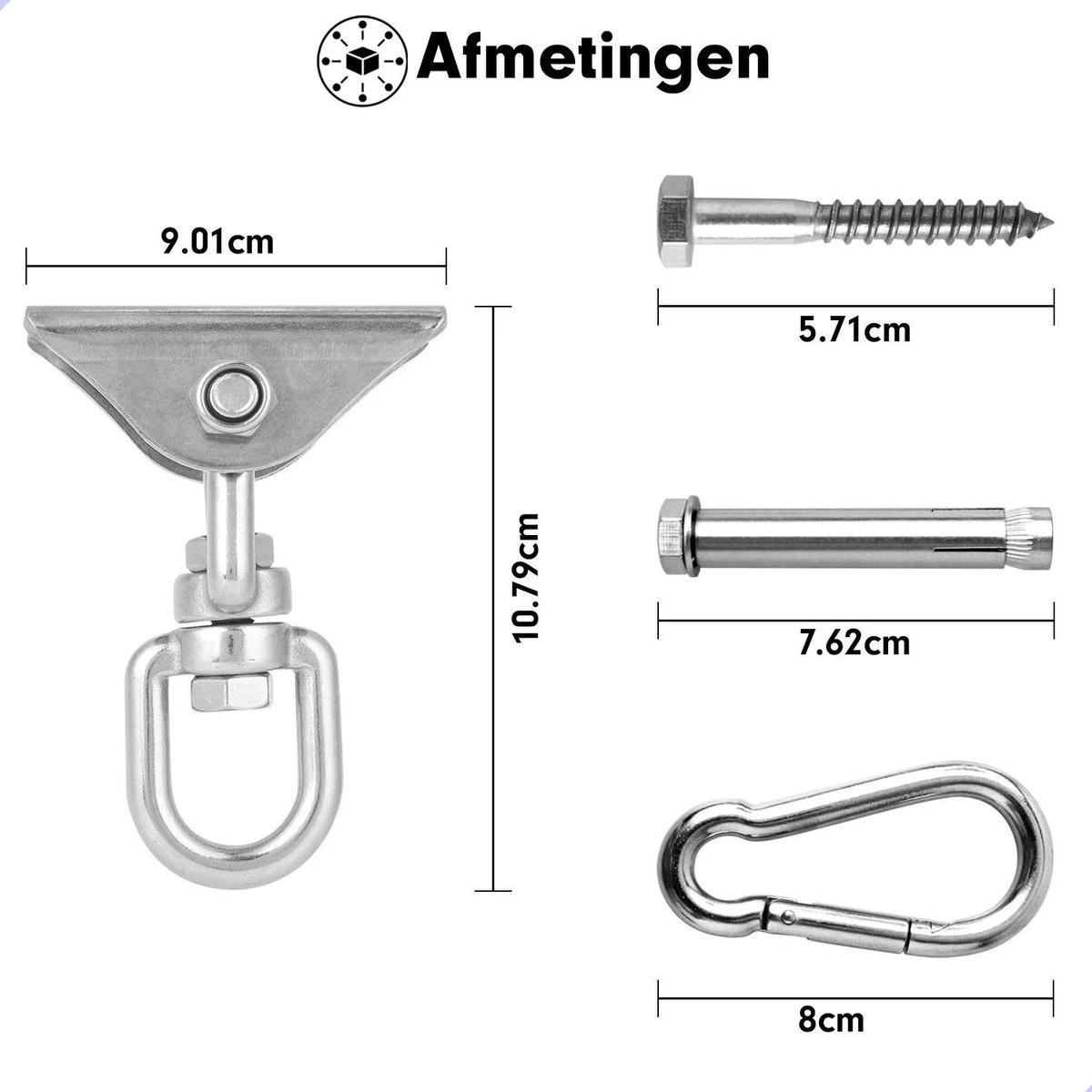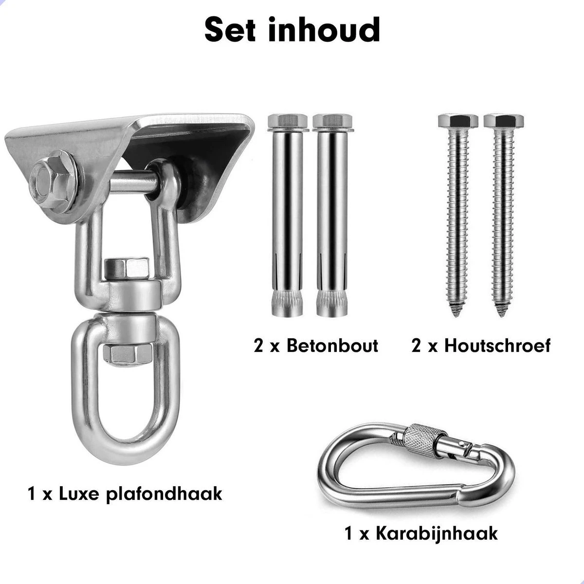 Geschikt voor hangstoelen, schommels, hangmatten en meer! De meest complete ophangset op de markt. Met de ophangset van DailyFox kunt u alles ophangen wat u wilt. De set bestaat uit het hoogwaardig RVS materiaal dat bestendigd is tegen alle weersomstandigheden.