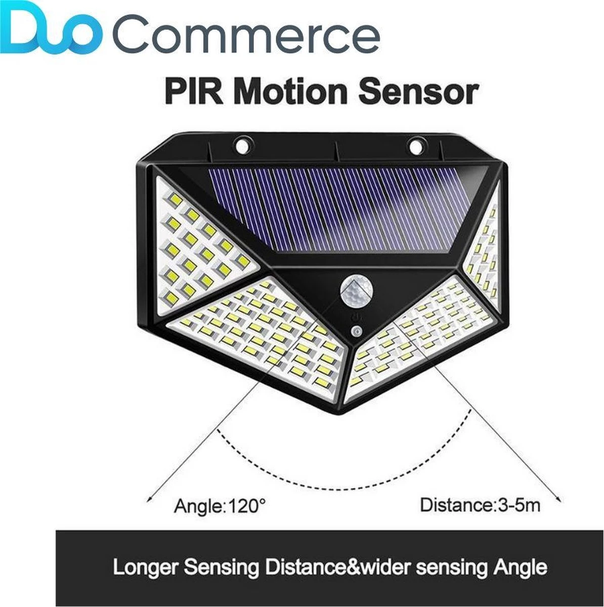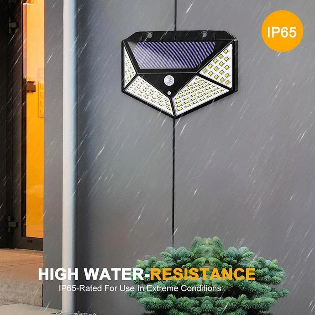De Solar 100 is een LED buitenlamp die werkt op zonne-energie, deze duurzame lichtvoorziening is hierdoor kostenbesparend! De Solar100 is bestand tegen extreme weeromstandigheden door zijn waterproof rating van IP65. De Solar 100 is gemakkelijk binnen twee minuten op te hangen, geen gedoe meer met stroomkabels aanleggen of batterijen vervangen! De Solar 100 laad zich bij voldoende daglicht binnen 4-6 uur volledig op. Productbeschrijving: Solar verlichting: De solar 100 levert 500 Lumen op wat dus zeer veel verlichting oplevert.Alle solar lampen zijn voorzien van een schemersensor. Dit betekent dat de lamp automatisch gaat branden wanneer het schemerig wordt. Door de bewegingssensor brandt de lamp alleen wanneer er beweging wordt gedetecteerd, dit zorgt voor stroombesparing. Drie standen modus: De Solar 100 heeft 3 verschillende standen.Stand 1: Medium licht wat continu brand (ongeveer 4 tot 6 uur).Stand 2: Gedimd licht wat continu brand, bij detectie van beweging fel licht gedurende 30 seconden. Stand 3: Geen verlichting, bij detectie van beweging fel licht gedurende 30 seconden. Weerbestendigheid De Solar lampen zijn gemaakt voor buiten en hebben daarom ook een waterproofrating van IP65. Dit zorgt ervoor dat de lamp bestand is tegen elk weertype! Bovendien is de lamp ook stofdicht en geschikt voor opwaaiende stofdeeltjes. Gemakkelijk monteren Het monteren van de Solar is zeer gemakkelijk. Wij leveren pluggen en schroeven mee zodat het monteren binnen een paar minuten gedaan is! Wij adviseren om de lamp op plek te monteren waar veel daglicht is. Functies: Zonne-paneel Bewegingssensor Nachtsensor Dimfunctie Verschillende standen Waterdicht ip65 Heldere en wijde verlichtingsbereik 24 maanden garantie Li-ion Batterij 1200 mAh COB Led verlichtingProductspecificaties Materiaal: Kunststof van ABSLumen: 500Leds: 100 ledsWaterdicht: ip65Sterkte: 2W/5.5VBewegingssensor: Ja, detecteert vanaf 3-5 meterNachtsensor: JaStanden: 3Afmetingen: 13.5×9.8x5cmGewicht: 145 gramKleur: Warm witVerlichtingsbereik: 120 graden