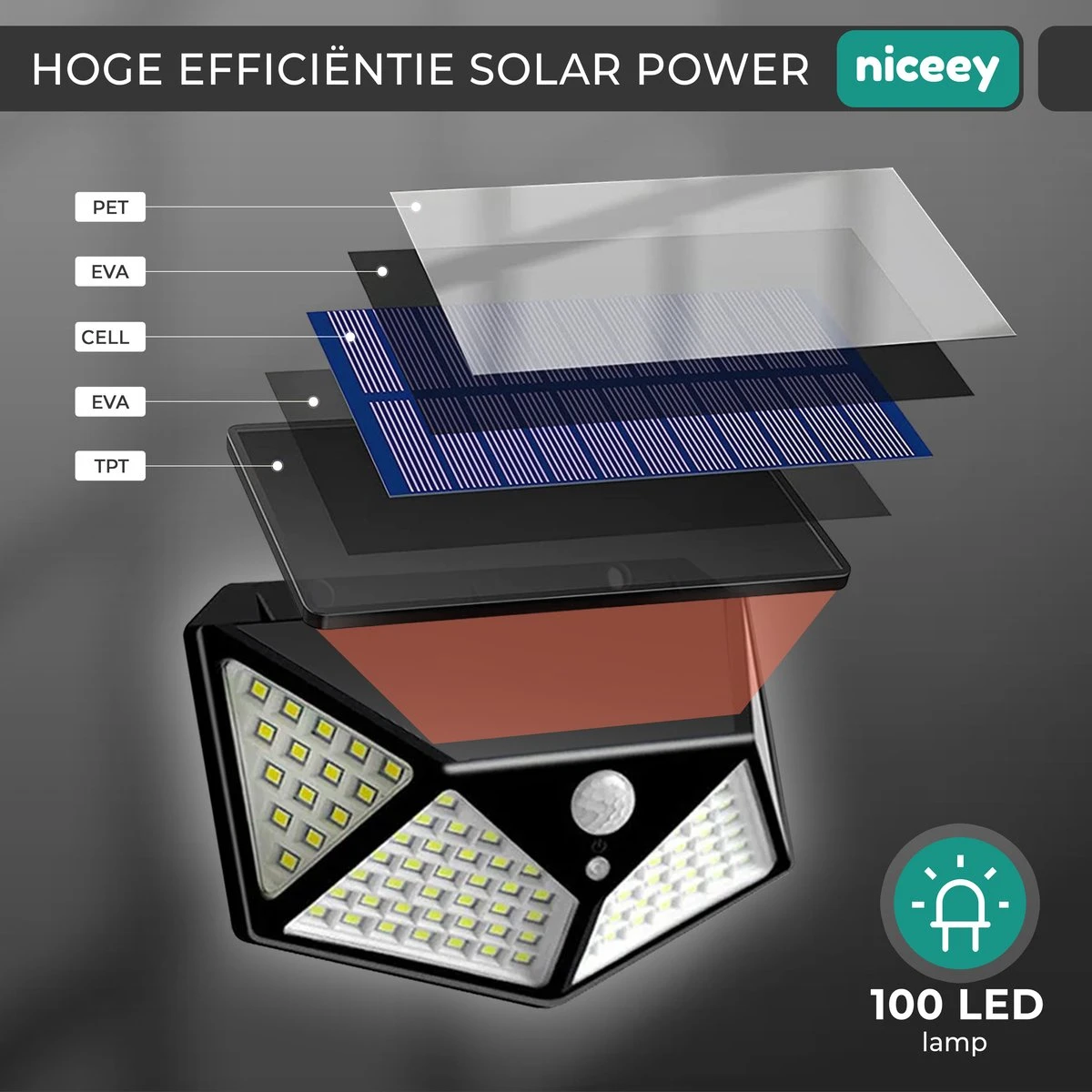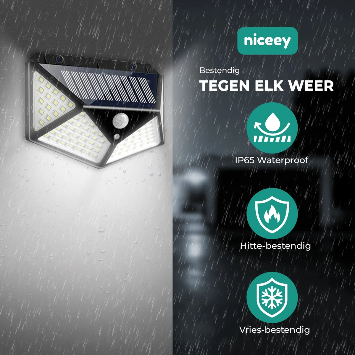 Niceey Solar Buitenlamp Met Bewegingssensor – 100 LED’s – Wit Licht – Zonne-Energie – Wandlampen – Buiten Lamp – IP65 Waterdicht – 2 Stuks