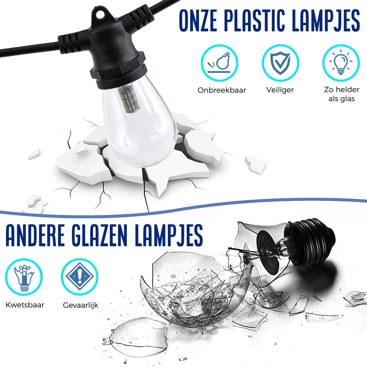 Dit lichtsnoer met solarlampjes heeft een IP65 rating, wat betekent dat het armatuur bestand is tegen zowel een krachtige waterstroom als stof. Hierdoor kan het solar lichtsnoer buiten blijven hangen, ongeacht het seizoen. Omdat het lichtsnoer op zonne-energie werkt, heb je geen stopcontact nodig en installeer je het zeer eenvoudig. Hang het solar lichtsnoer voor buiten op, laat deze een paar uur opladen en voilà: klaar voor gebruik.