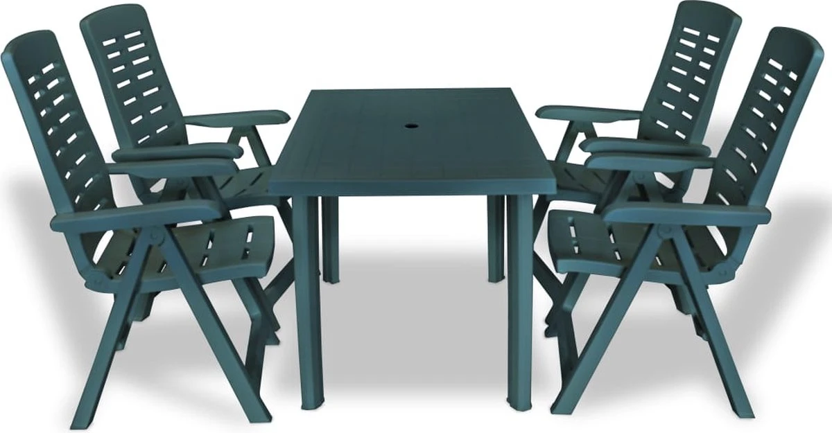 De tuintafel heeft een parasolgat waardoor hij ook gebruikt kan worden met een parasol, zodat je koel en in de schaduw blijft. De rugleuningen van de stoelen hebben 4 kantel-instellingen, zo kan je altijd de meest comfortabele positie vinden. De stoelen kunnen ingeklapt worden om ruimte te besparen wanneer ze niet worden gebruikt. Deze tuinset is ook lichtgewicht, wat hem makkelijker te verplaatsen maakt.