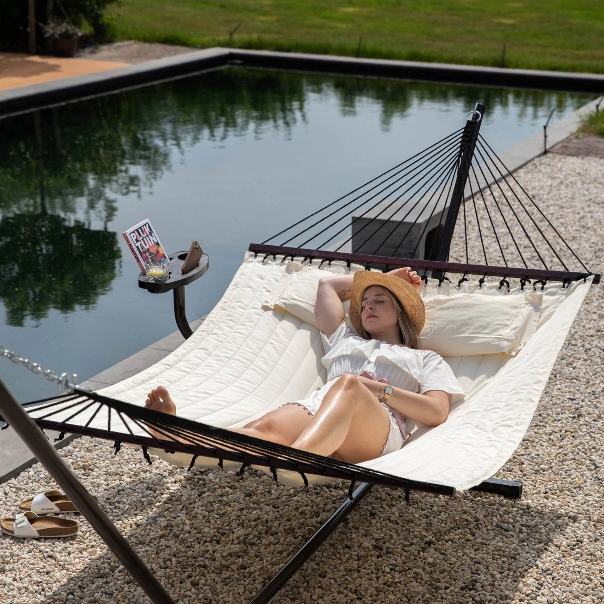 Vita5 Hangmat Met Standaard En Spreidstok – 2 Persoons – Incl. Bekerhouder – Afneembaar Kussen – Uv-bestendig – Beige