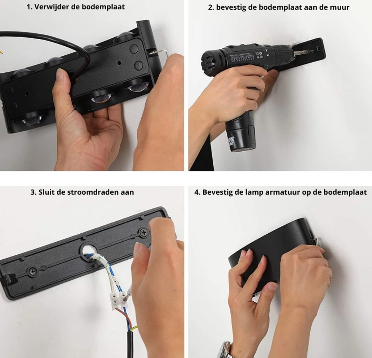 Het enige wat u hoeft te doen is de muurlamp op te hangen en aan te sluiten op 230 volt netstroom. In de handleiding vind u uitgebreidere informatie.